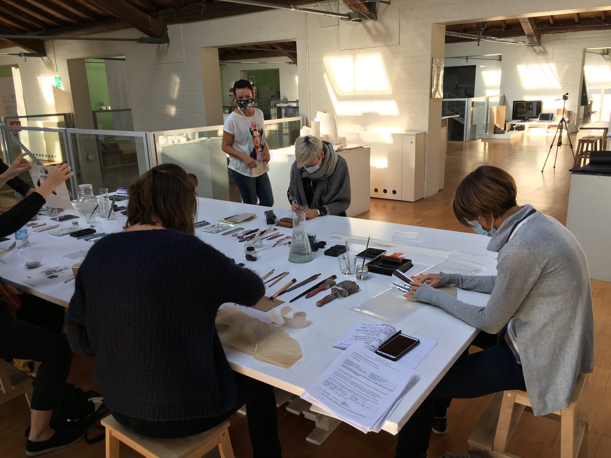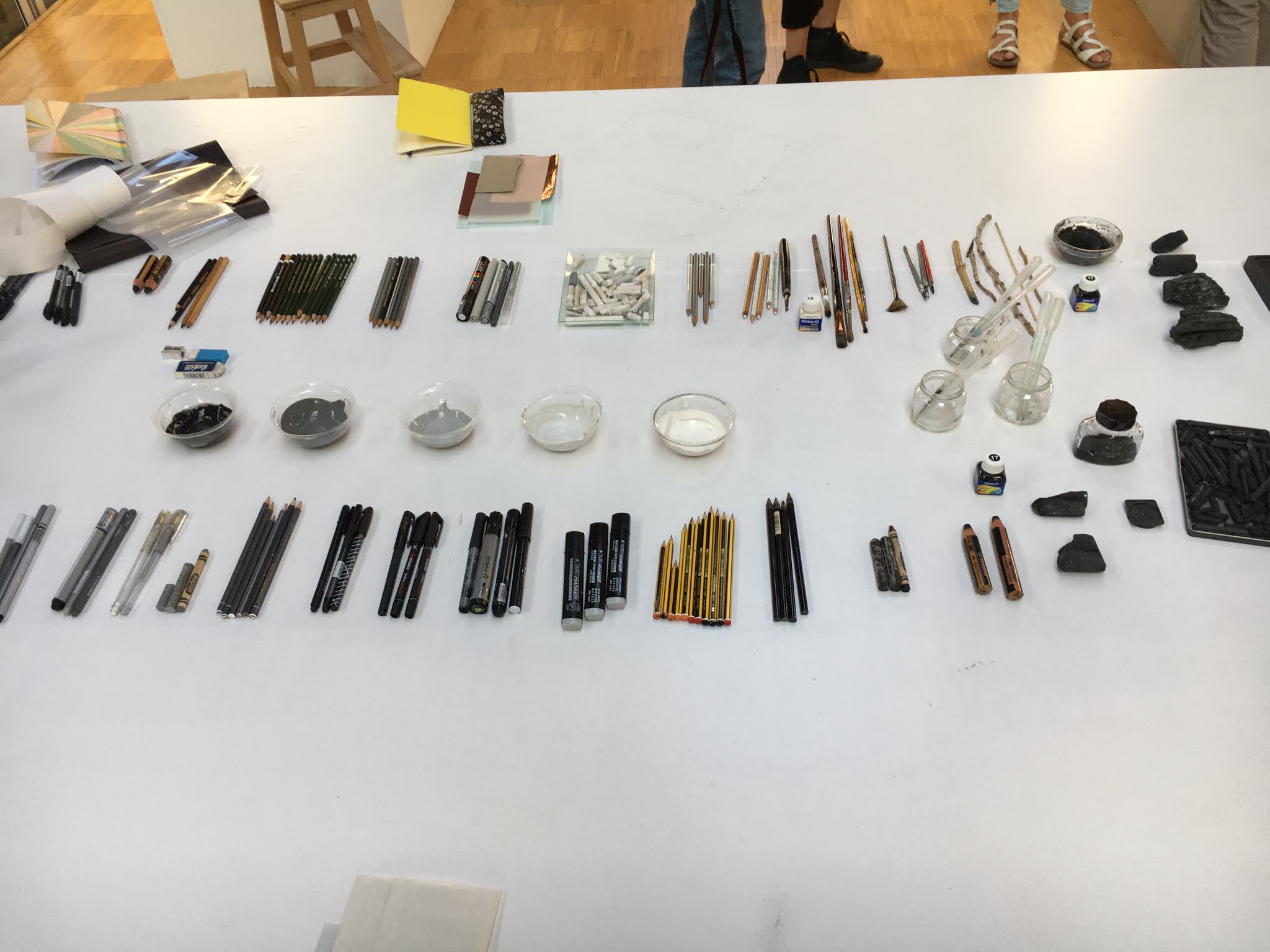 " Le Mosaïque de marques, de mots et de matériaux Atelier est une invitation à essayer et à expérimenter des outils de marquage et des surfaces matérielles inattendues. L'atelier offre une gamme variée d'outils qui laissent des marques différentes, et des surfaces de matériaux, de textures et de tailles différentes."